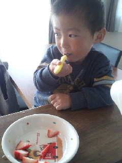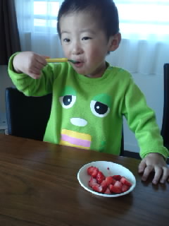 果物をあまり食べないマルですが、試しにイチゴをあげると、バクバク食べました。