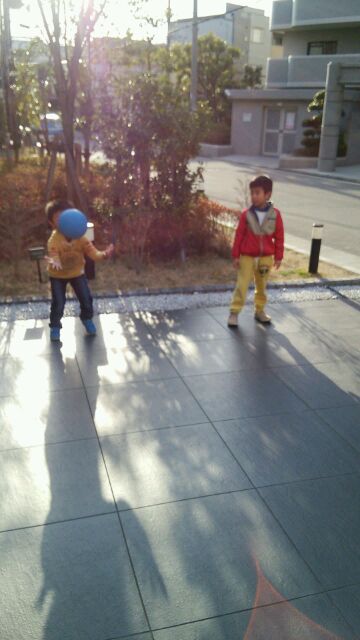 スイミングから帰って来たら、お隣さん親子がマンションの前で遊んでいました。