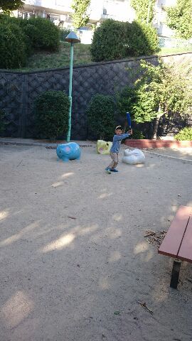 空き地みたいな広い所やと、ボールが遠くへ飛んで行っていちいち大変やから、小さい公園の方がやりやすい。