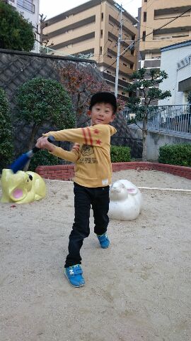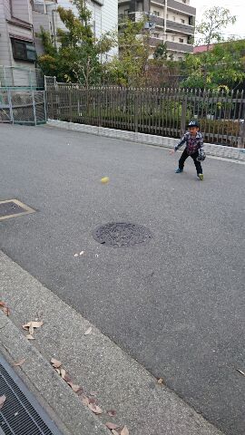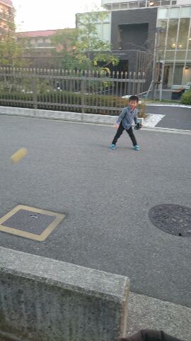幼稚園から帰って来てから、マンションの前で壁当て。