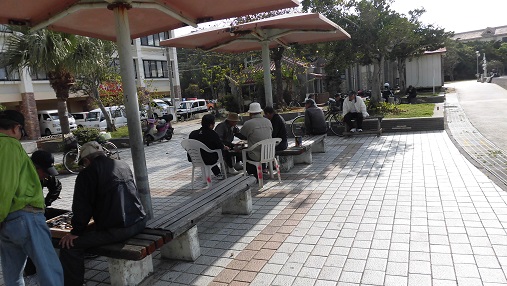 浜辺のベンチでは、おっさん達が囲碁していました。
