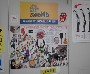 SOUND M'Sという店で、カウンター席が5席程と、テーブル席が数席ある広々とした空間です。ちょうど僕が入ったときは、おじさん3人組のバンドがビートルズの「All My Loving」を歌っていました。